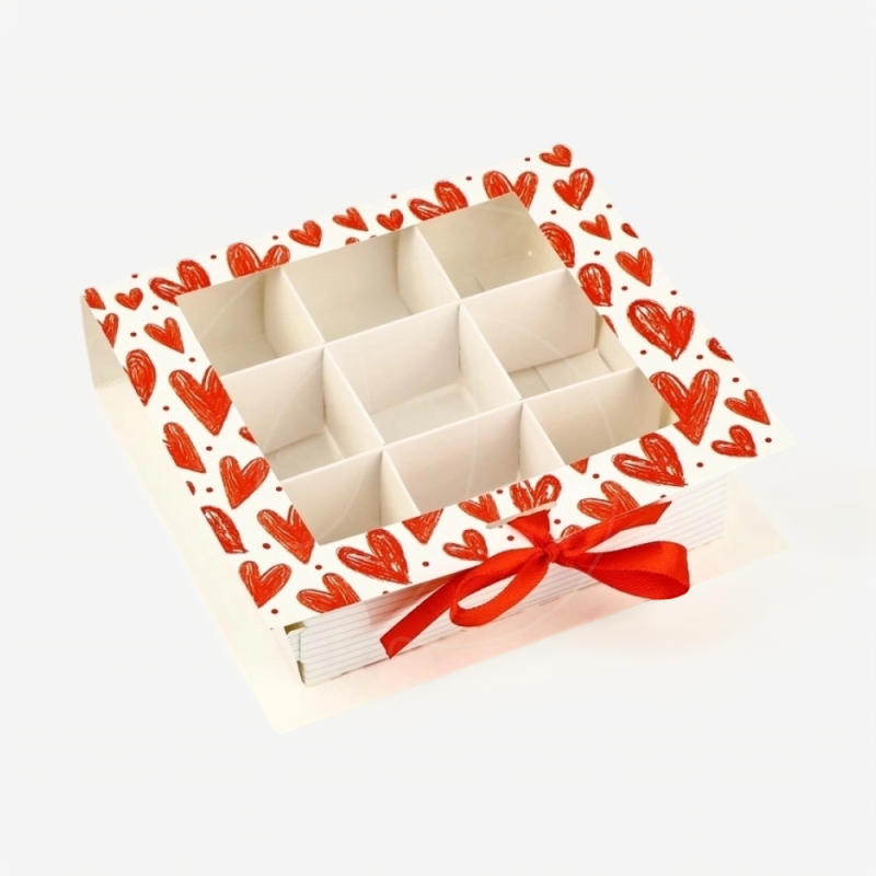 Доставка Коробка на 9 конфет с окном "Сердечки" 14,5х13,5х3,5 см из магазина в вашем городе:
